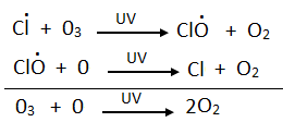Chlorine free radical reacts with ozone to form chlorine monoxide (CIO) and molecular oxygen. CIO reacts with atomic oxygen produced by the decomposition of ozone by UV radiations.